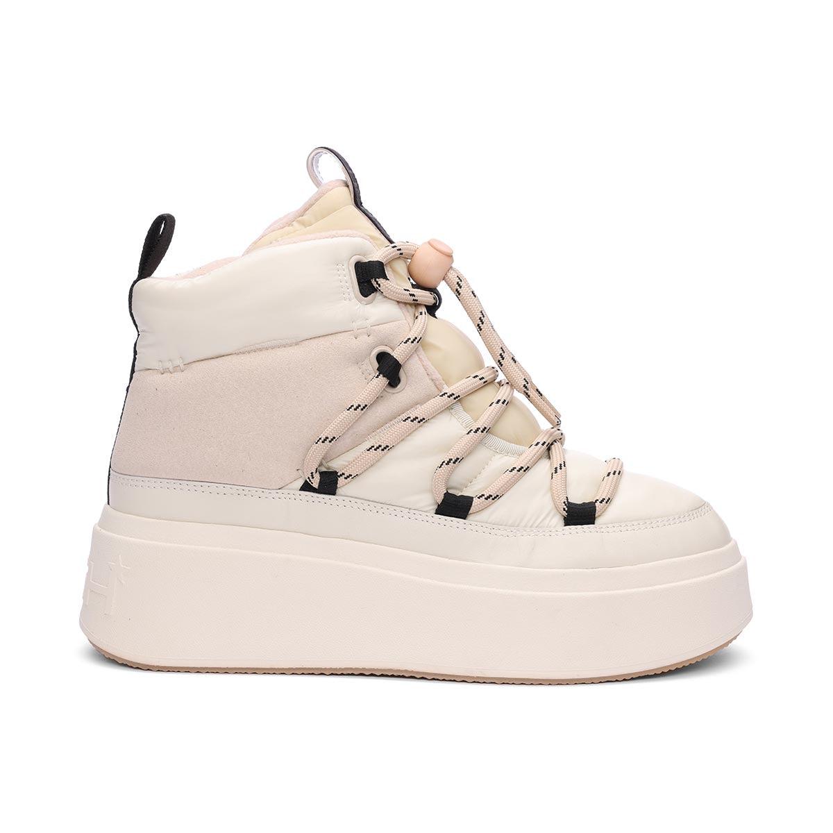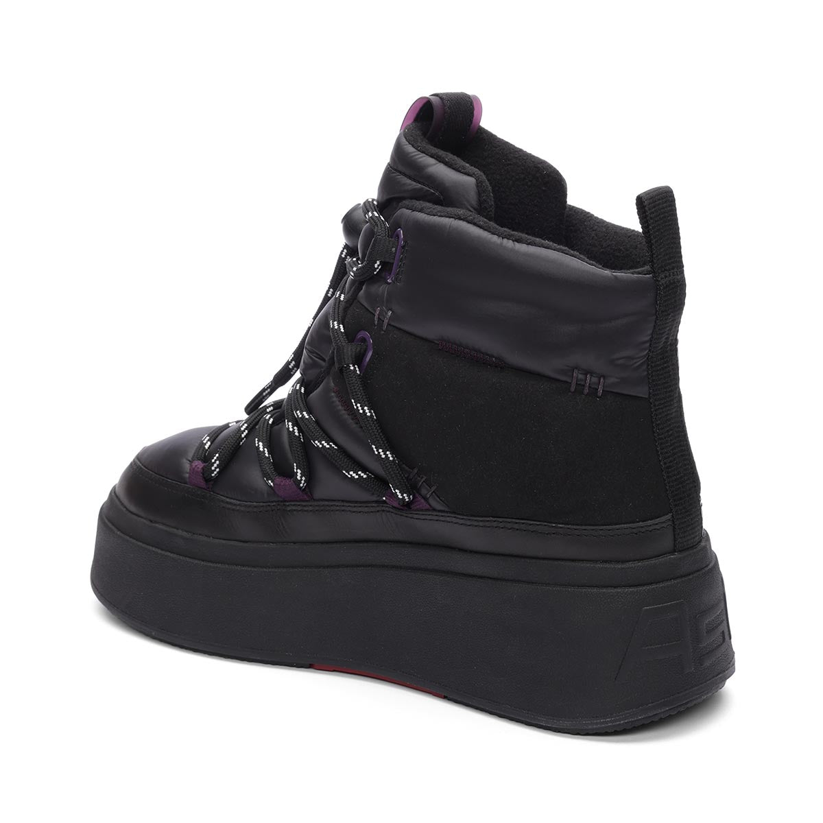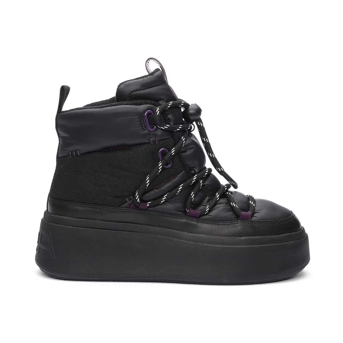 Meet the trendy and innovative MONTANA Puffer Boots. This captivating pair of women's winter puffy boots seamlessly blends elements of fashion and outdoor activewear. Crafted from shiny, puffy nylon and soft leather, these elevated snow boots offer an eye-catching combination of unique materials. The creative lacing system adds a modern touch and adds to the overall appeal of these nylon boots. Standing on ASH's signature platform soles, these puffer boots make a bold fashion statement while ensuring a comfortable walking experience for winter adventures.