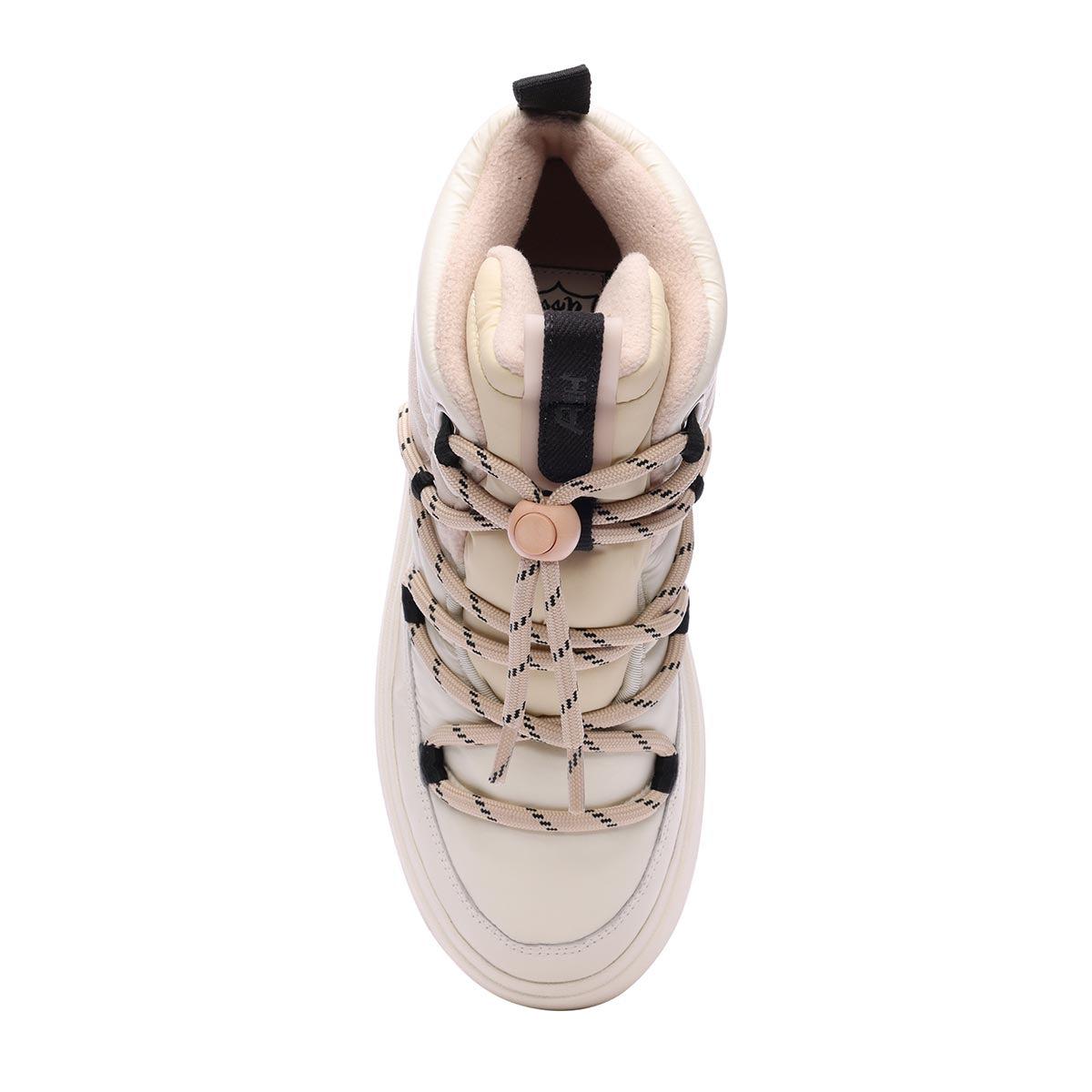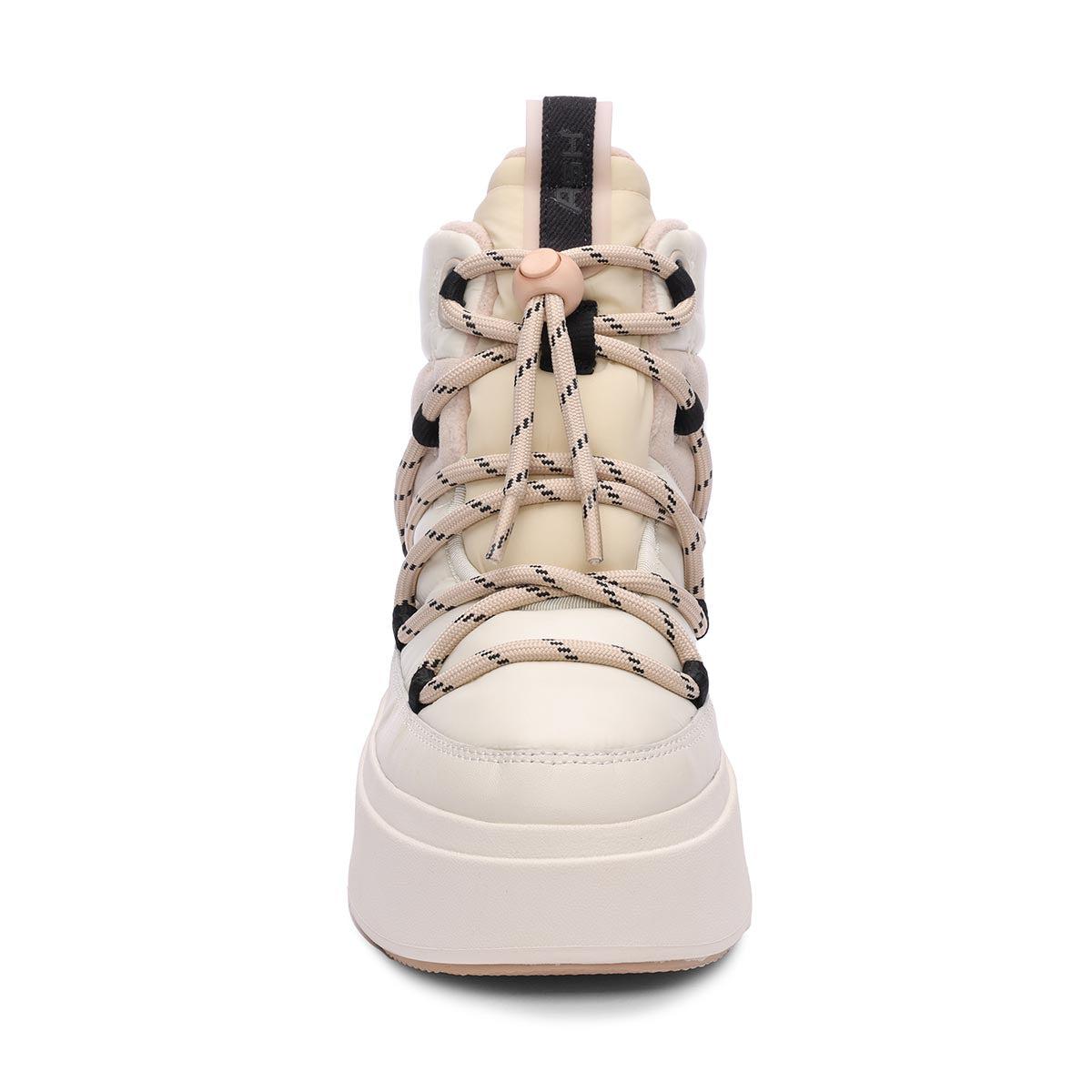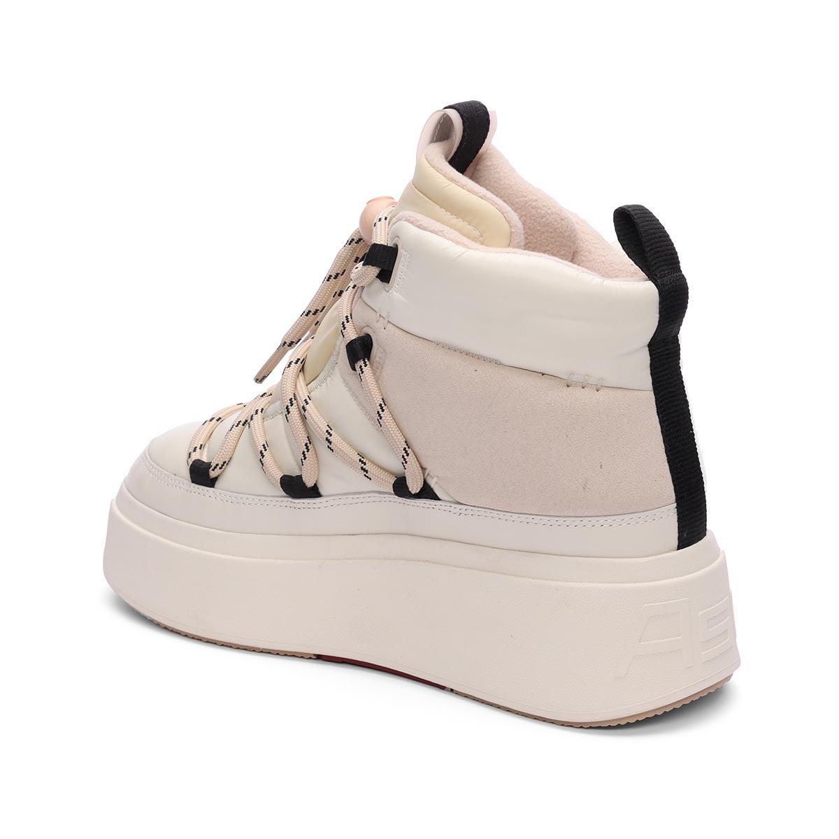 Meet the trendy and innovative MONTANA Puffer Boots. This captivating pair of women's winter puffy boots seamlessly blends elements of fashion and outdoor activewear. Crafted from shiny, puffy nylon and soft leather, these elevated snow boots offer an eye-catching combination of unique materials. The creative lacing system adds a modern touch and adds to the overall appeal of these nylon boots. Standing on ASH's signature platform soles, these puffer boots make a bold fashion statement while ensuring a comfortable walking experience for winter adventures.
